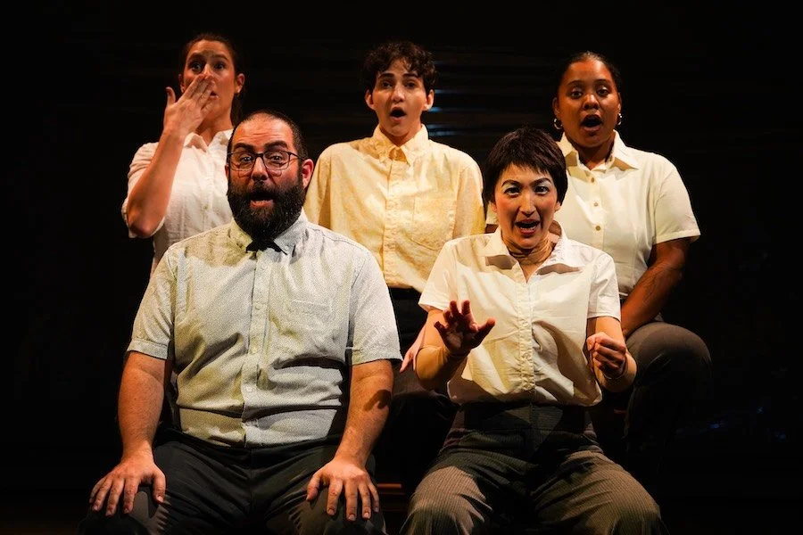 (Back:) Isabelle Jennings-Pickering, Oz Heiligman, and Jasmine Proctor; (front:) Lee Liebeskind, and Janine Baumgardner. The ensemble recreates an episode of New Treasure Island through movement and onomatopoeia in ‘Astro Boy and the God of Comics.’ Photo by Kelly Colburn, Flying V.